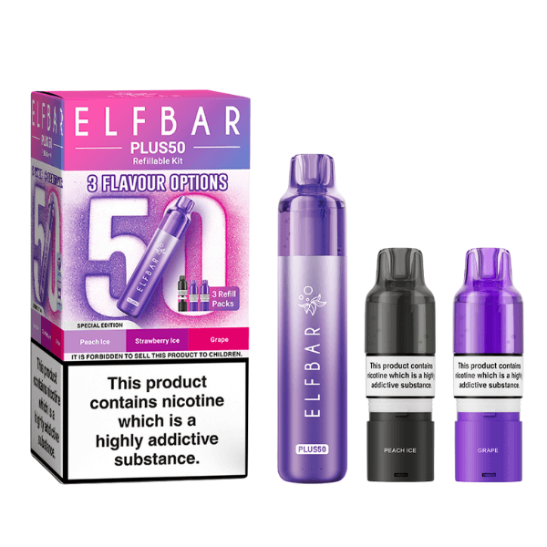 Each kit includes three replaceable Elf Bar Plus 50 refill packs, with each pack containing a prefilled 2ml pod and an 8ml refill container. The device is designed for MTL (Mouth To Lung) vaping, delivering a smooth, discreet inhale that closely replicates the draw of a traditional cigarette.