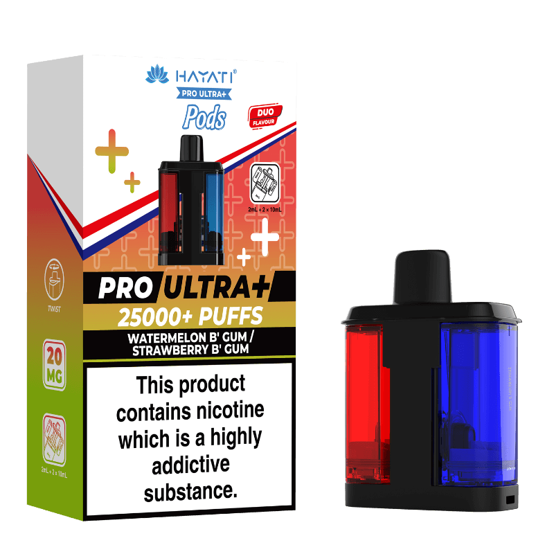 The Watermelon B'Gum and Strawberry B'Gum Hayati Pro Ultra Plus Refill Pack brings together two chewy-sweet classics in one bold vaping combo. Enjoy the juicy freshness of watermelon bubblegum and the rich, candy-coated sweetness of strawberry bubblegum in every puff—ideal for sweet tooth vapers and fans of retro candy blends.